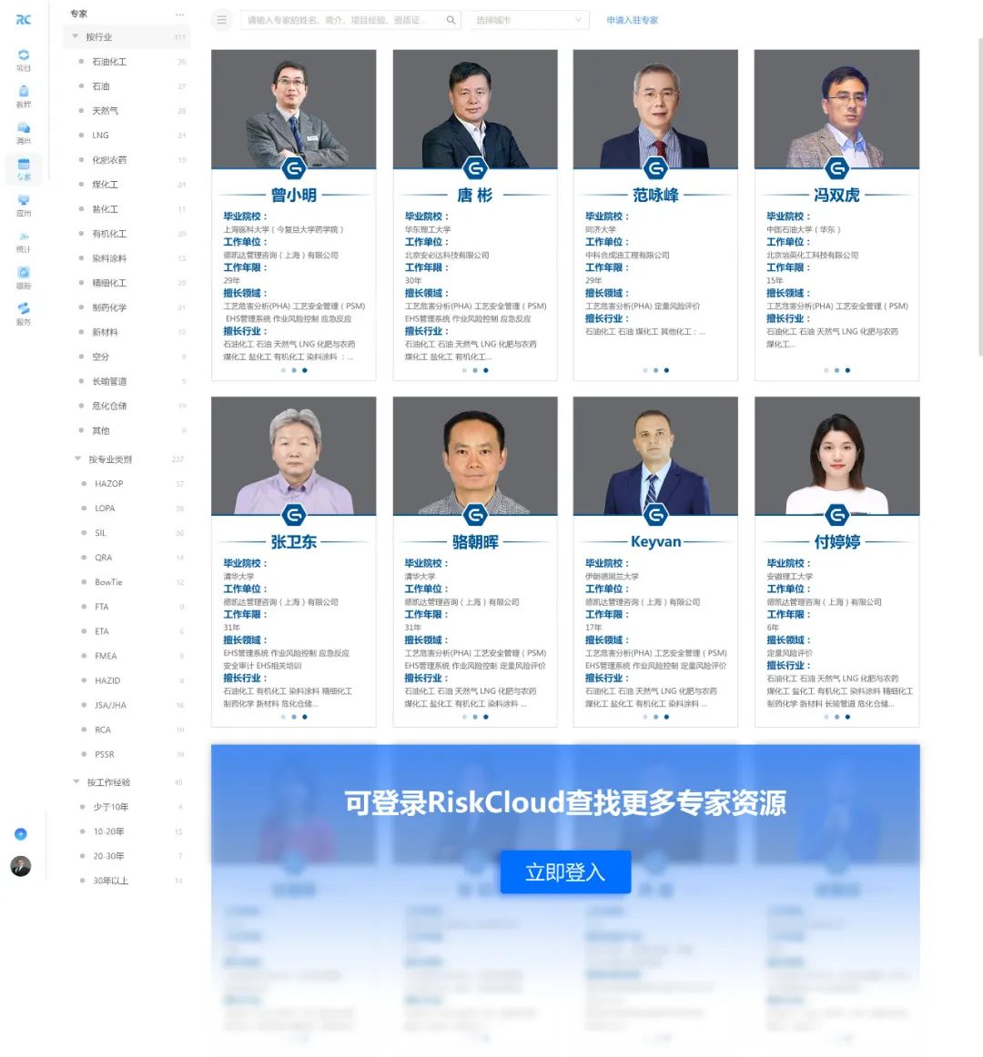 我们也可以根据客户的需要,为客户遴选推荐擅长其行业及工艺和所需风险咨询服务专业类别的专家。并且专家会在RiskCloud进行开展工作,较终实现风险评估报告数字化交付。