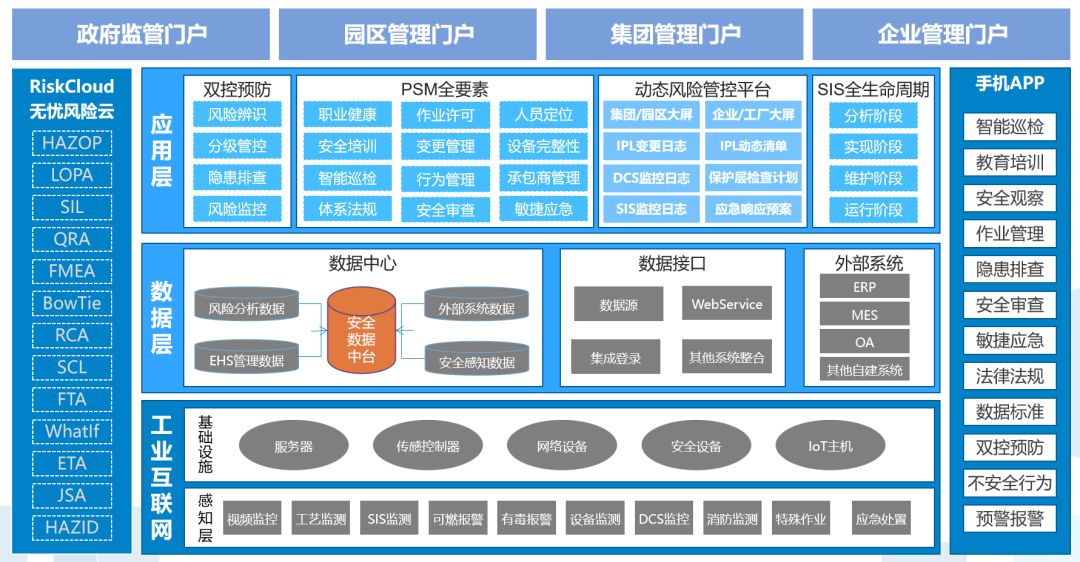 歌略“以RiskCloud为核心的《歌略安全风险信息化云服务平台》”整体架构设计上,按照感知层、企业层、园区层、政府层“多层布局、三级联动”的思路,推动企业、园区、行业、政府各主体多级协同、纵向贯通,覆盖危险化学品生产、储存、使用、经营、运输等各环节,实现全要素、全价值横向一体化。