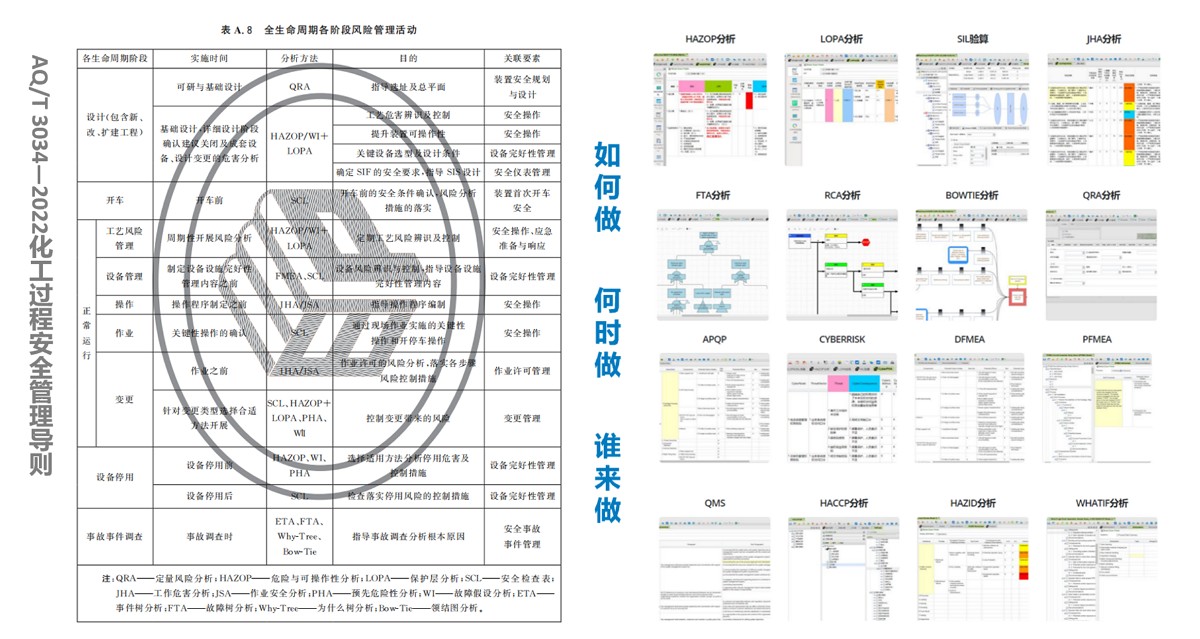 RiskCloud提供一站式风险管理解决方案,包含了AQ/T 3034-2022《化工过程安全管理导则》附录A-表A.8“全生命周期各阶段风险管理活动”中涉及的全部风险分析方法软件工具:HAZOP、LOPA、SIL、QRA、FMEA、JSA、BowTie、FTA、ETA、SCL、RCA、HAZID、WhatIF、PrHA、Dow等。