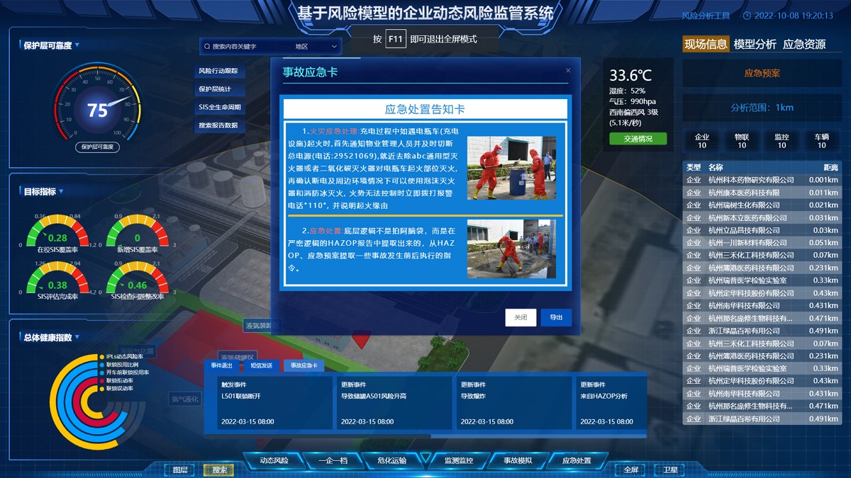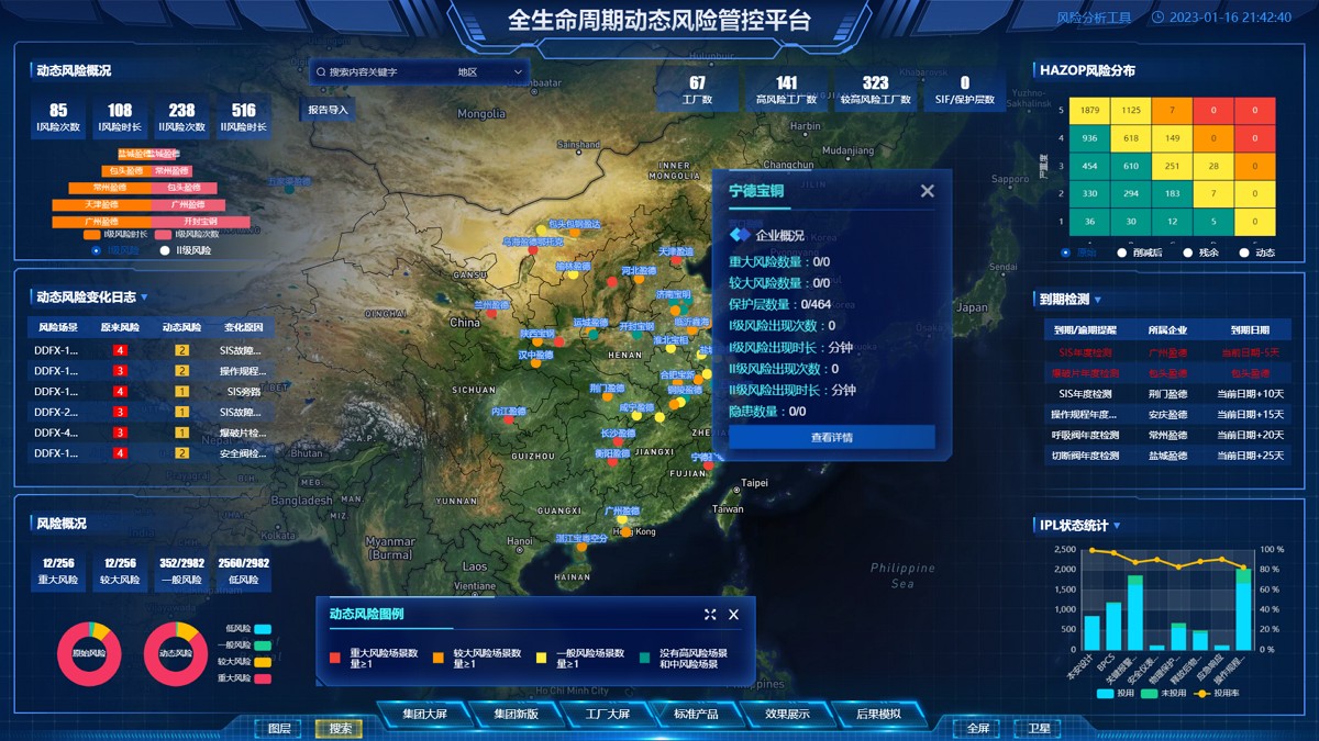 一张图动态展示企业实时风险、保护层和屏障动态风险状态、动态风险KPI指标、SIS、爆破片、安全阀等到期检测提醒、预警/报警信息等。