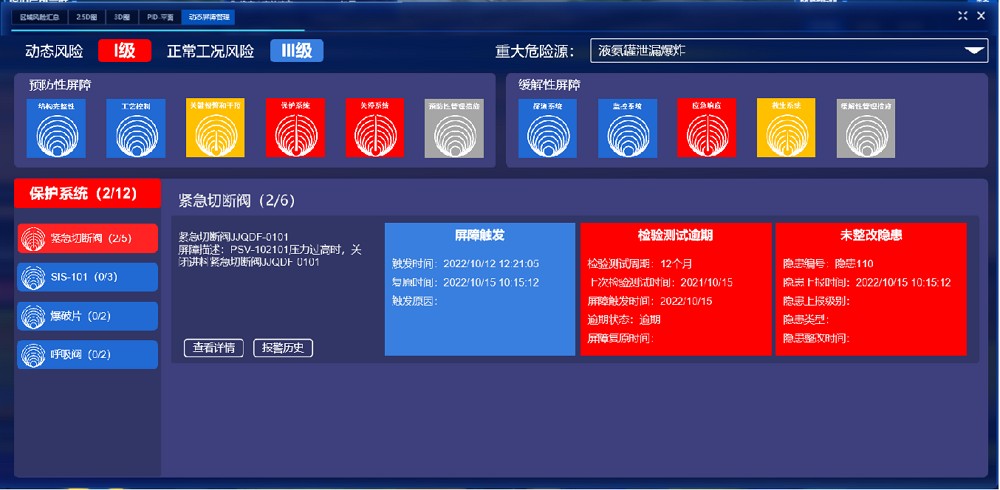 一张图动态展示企业重大危险源的屏障实时动态,监控所有保护屏障的健康状态, 动态反应各个风险场景的风险状态。并满足政府的监管要求。